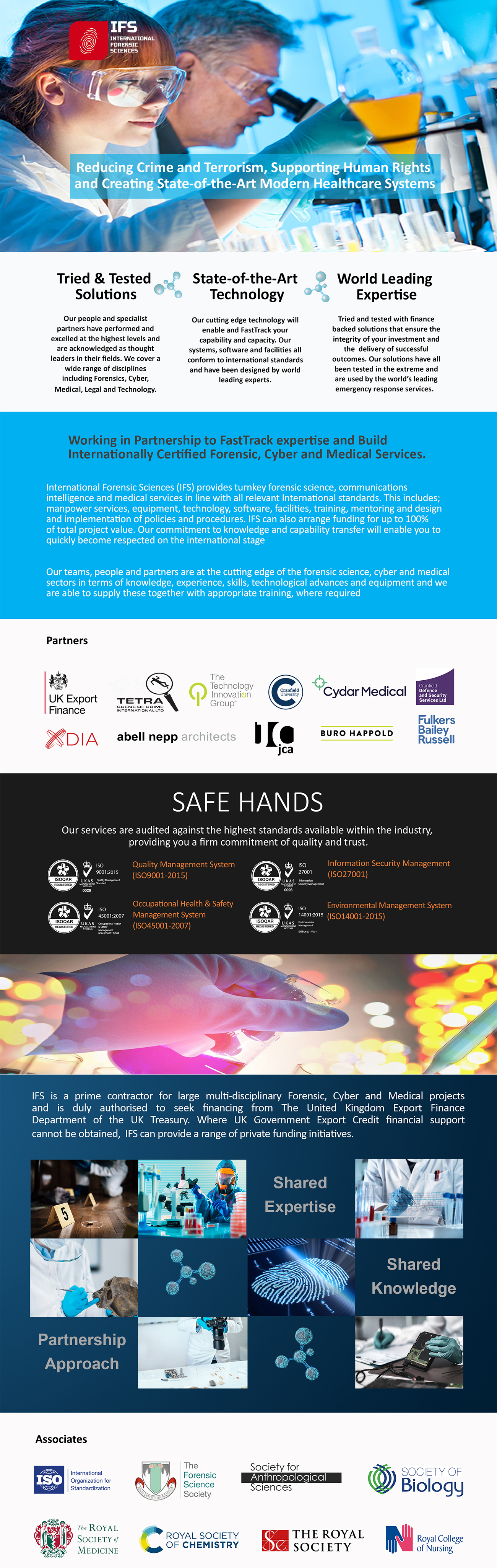 International Forensic Sciences (IFS) provides turnkey forensic science, communications intelligence and medical services in line with all relevant international standards. This includes, manpower services, equipment, technology, software, facilities, training, mentoring, design and implementation of policies and procedures. IFS can also arrange funding for up to 100% of total project value. Our commitment to knowledge and capability transfer will enable you to quickly become respected on the international stage.Our teams, people and partners are at the cutting edge of the forensic science, cyber and medical sectors in terms of knowledge, experience, skills, technological advances and equipment and we are able to supply these together with appropriate training, where required.